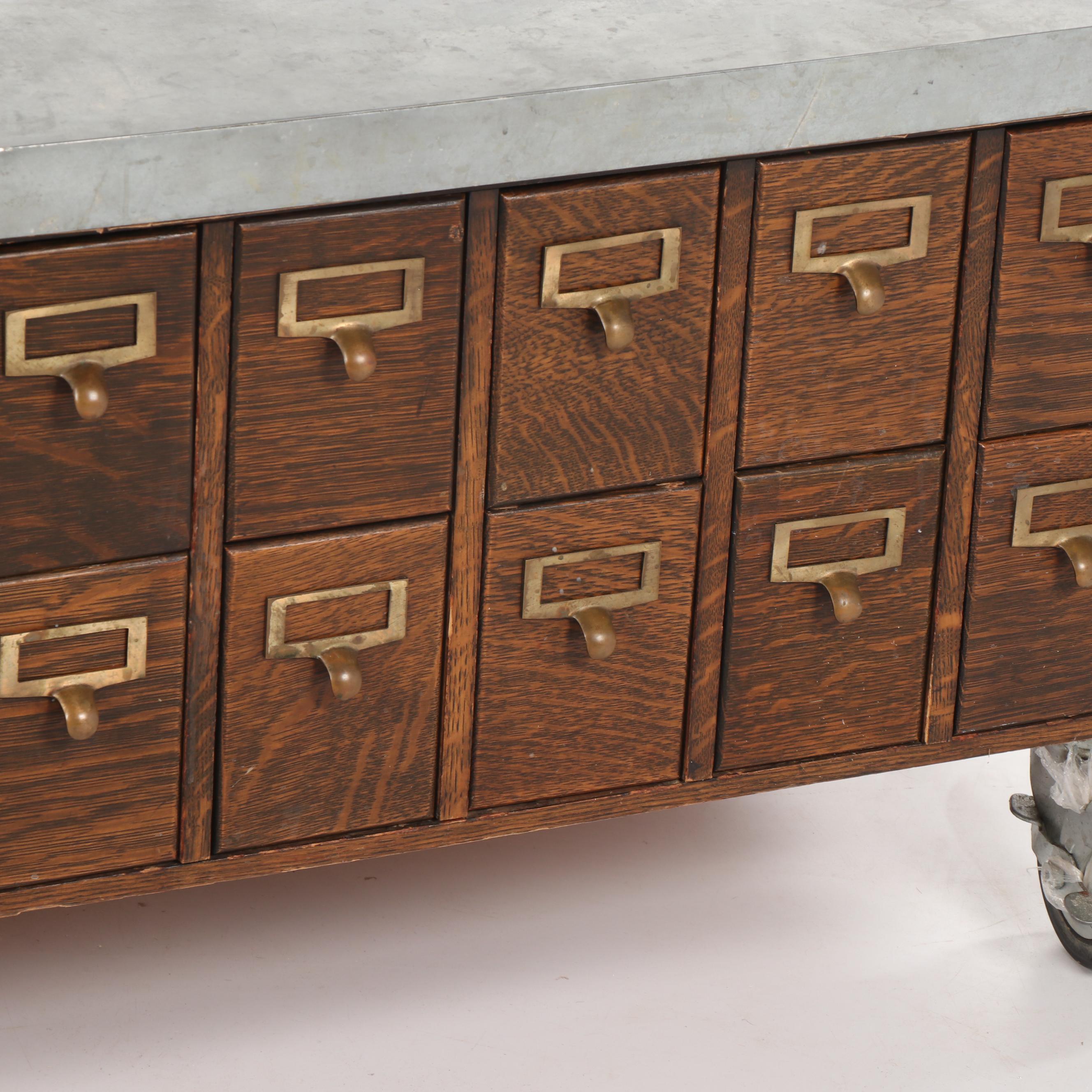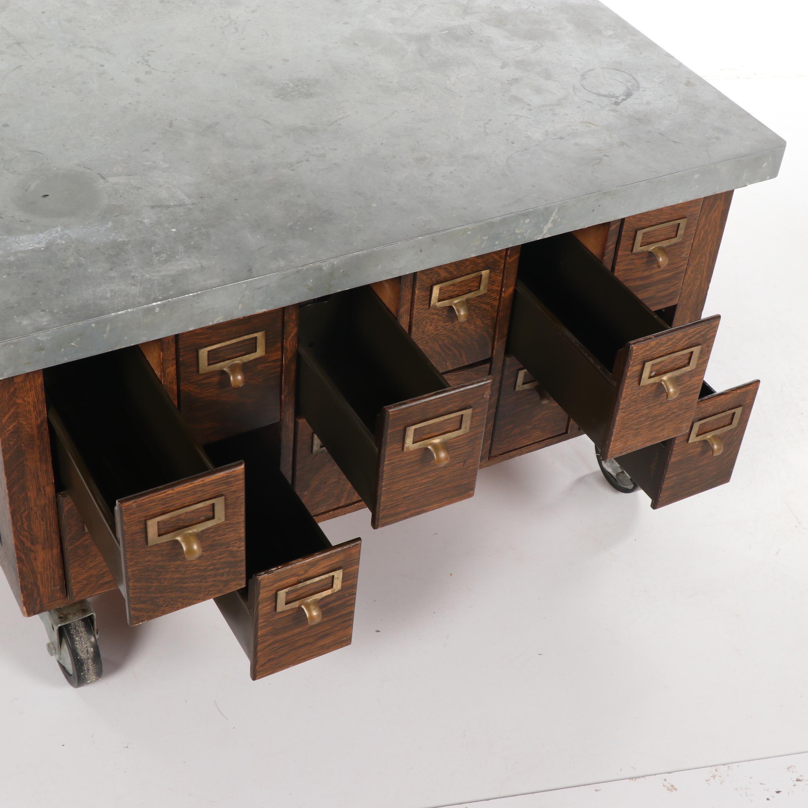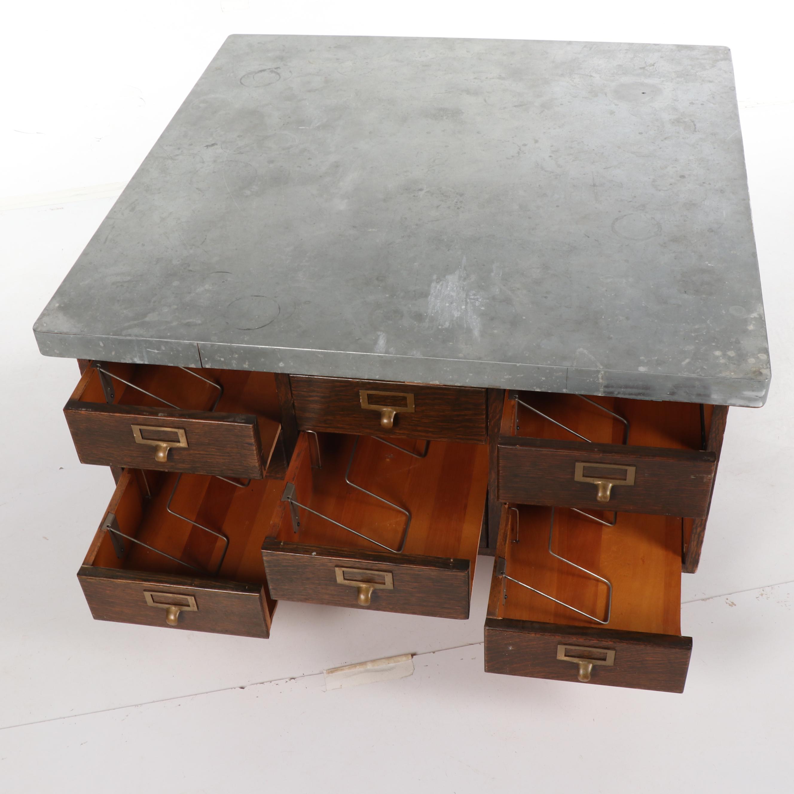 Oak and Zinc Card Catalog Coffee Table on Casters, Early 20th Century